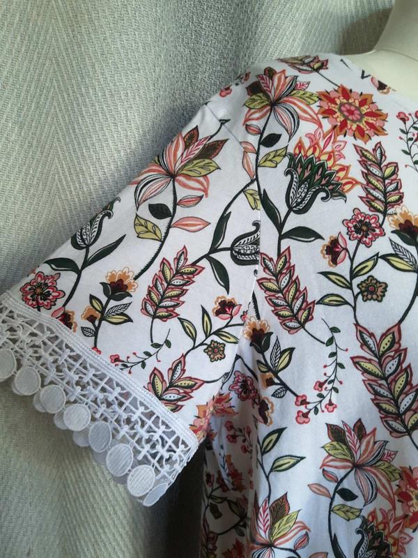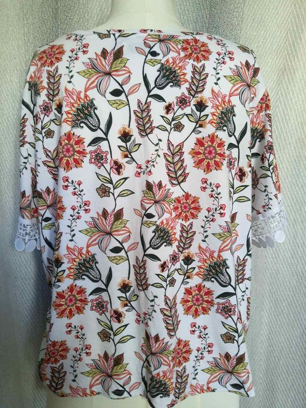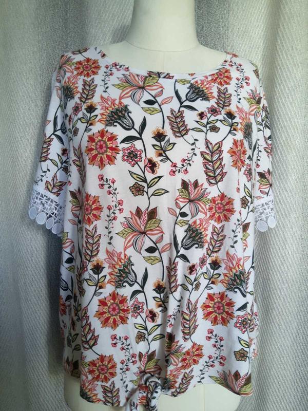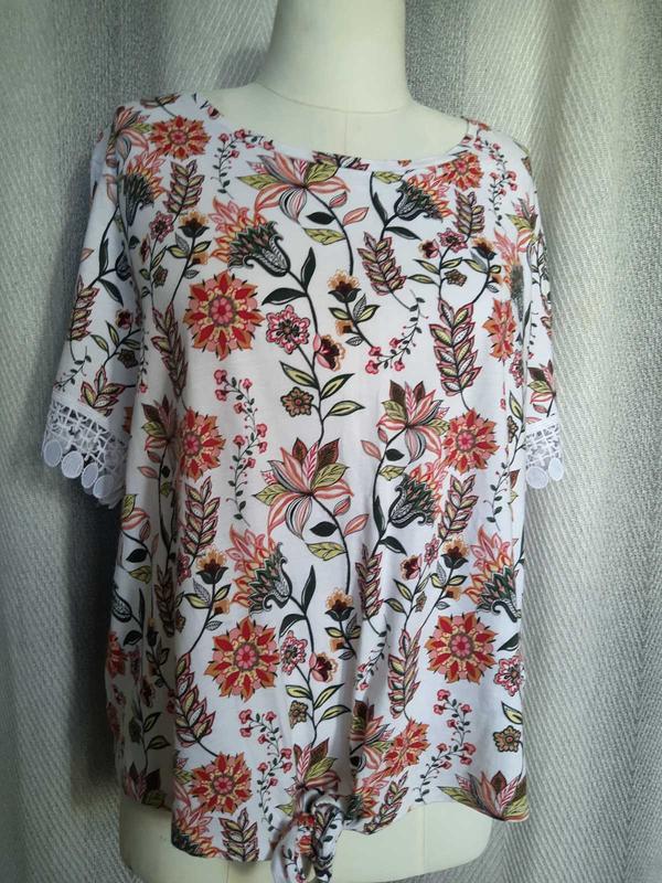100% коттон. Женская яркая трикотажная блуза, блузка, футболка на завязке, топ, мелкий цветок, кружево.