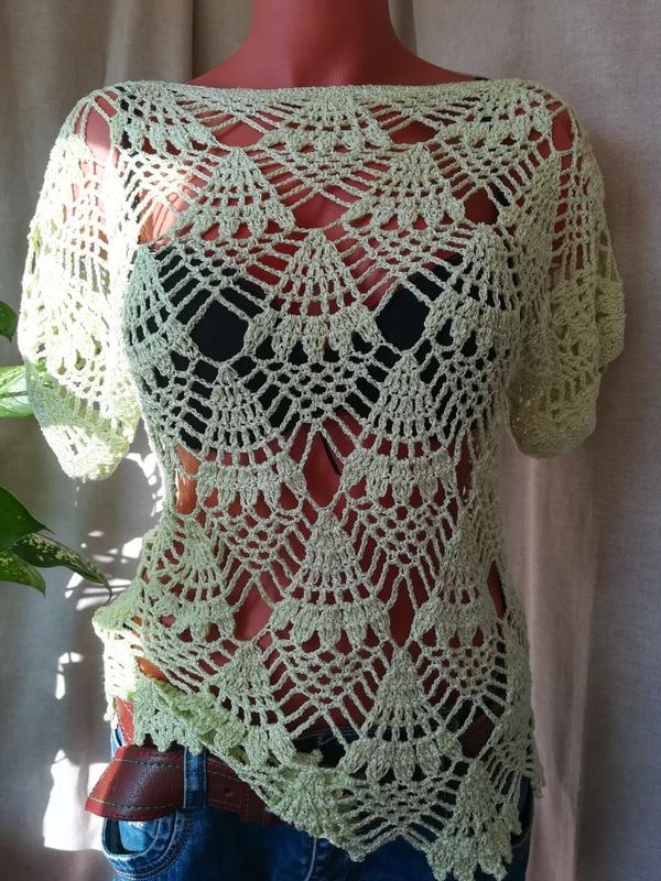 Світло-зелена ажурна майка. Літня мереживна кофта. Ажурна майка-кофточка — футболки підкреслять Вашу індивідуальність. Спущений рукав. Широка горловина — човник. Ширина 50 см. Від плеча до плеча — 70 см Довжина 48 см. Розмір 44. На розмір 42 — буде оверсайз.
