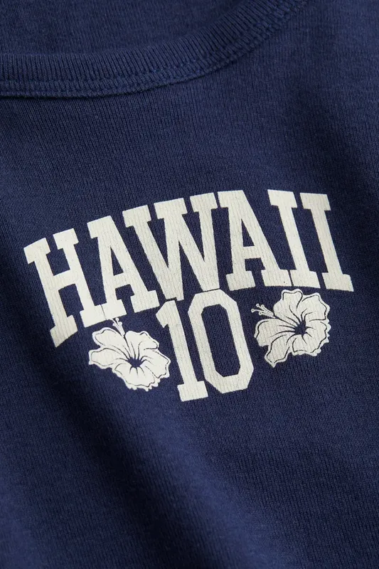 Укорочений топ з м’якого бавовняного трикотажу з текстовим принтом спереду. Вузький виріз спереду з трохи ширшим круглим вирізом. Ребриста обробка навколо горловини та пройм, а також оверлок.