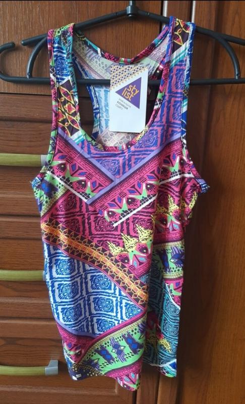 Яркая майка для спорта. Замер: ПОГ-33+, длина-55, хорошо тянется.