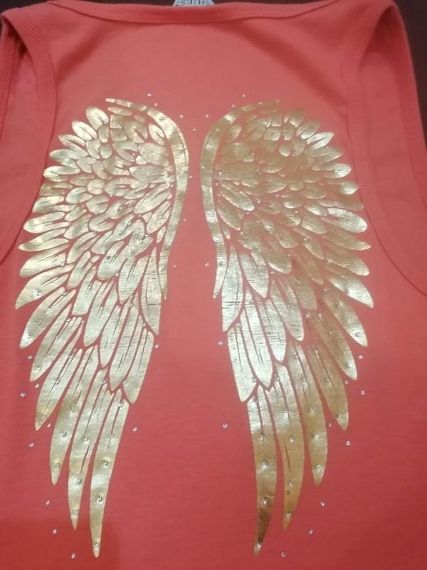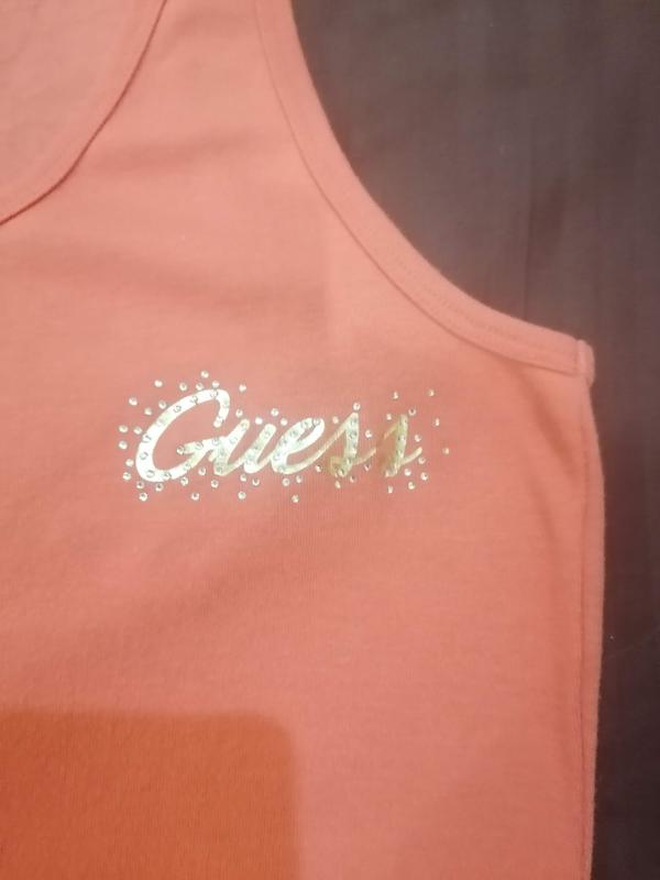Традиційна довга жіноча майка. Позаду характерні для Guess золотаві ангельські крила. Спереду на грудях напис Guess та приклеєні невеликі стрази. Ідеально буде поєднуватися з джинсами, шортами, легінсами. Добре сідає на розмір 16 UK або 44 EU.