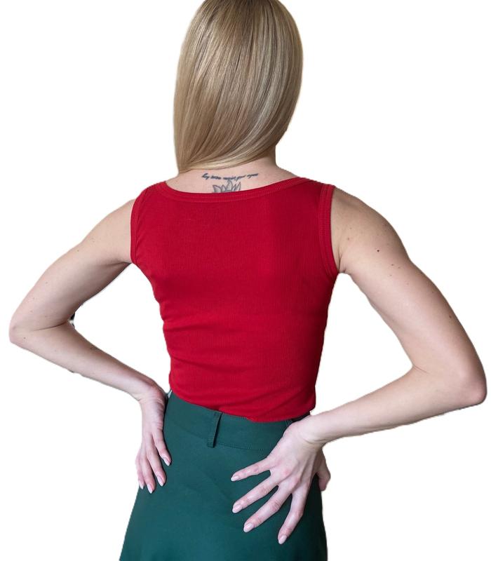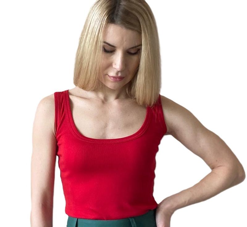 Трикотажна майка класичного фасону на широких бретелях. Оброблена стрічкою по контуру вирізу горловини та бретелей.