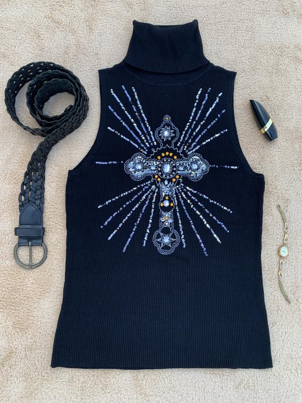 Гольф без рукавів Angela Davis. Новий, плівка зрізана. Розмір М, підійде і на L. Дуже добре тягнеться! Склад: 60% віскоза, 25% нейлон, 15% еластан. Всі камені і палетки на місці. Виміри в не розтягнутому стані: Довжина по спинці - 52 см Плечі - 25 см ПОГ - 34 см З низ - 36 см Горловина висота -18 см Горловина З - 14 см