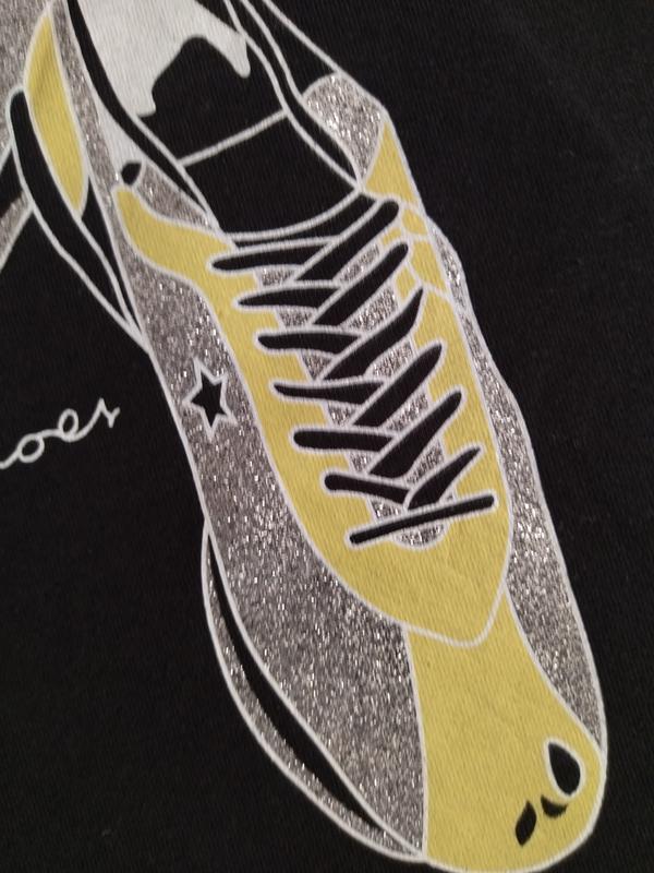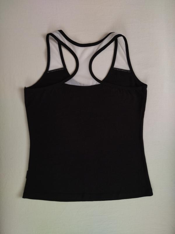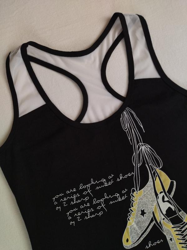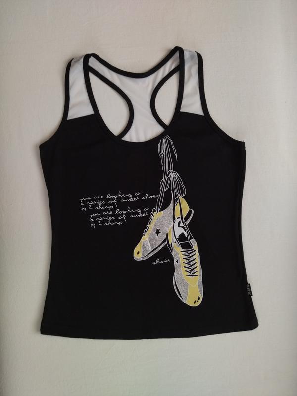 Маєчка без бирки, не носилася (не секонд), але доволі тривало зберігалася. Є маленькі малопомітні нюанси, спереду та ззаду на плечі цятка (показано на останньому та передостанньому фото). Колір майки чорний, зверху білі вставочки з сіточки, спереду принт білого, жовтого (світло-гірчичного) та сріблястого кольорів. Розмір не вказано. Орієнтовно підійде на 42-44 (S-XS) розмір. Тканина тягнеться, 82% бавовна, 8% спандекс. Одяг зберігається у складеному вигляді, потрібно буде відпарити чи попрасувати.