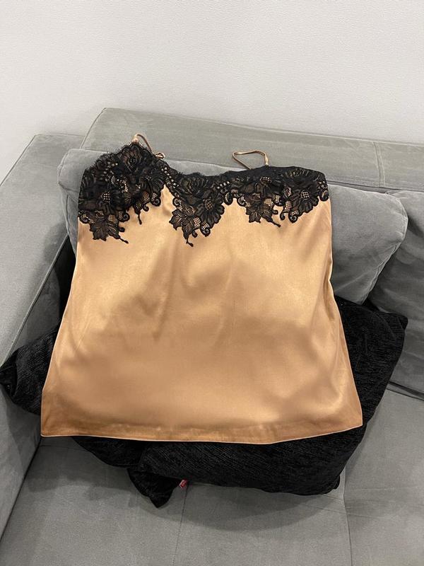 Майка золотого кольору з 100% натурального шовку, розмір S: об'єм грудей 88 см(тягнеться), довжина 60 см, бретелі регулюються.