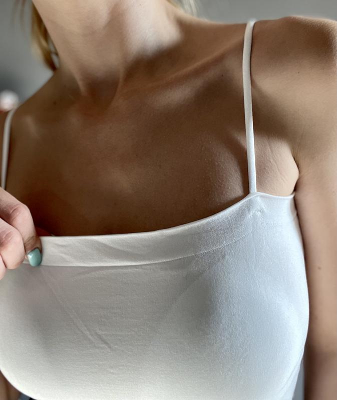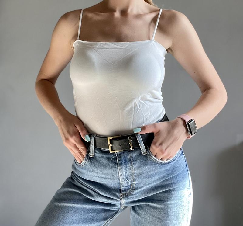 Новий білий топ. Матеріал добре тягнеться . Розмір універсальний . На грудях є підкладка та вшиті чашечки . Матеріал: поліестер