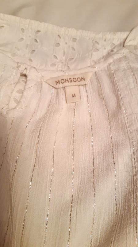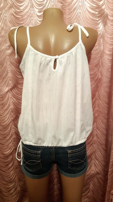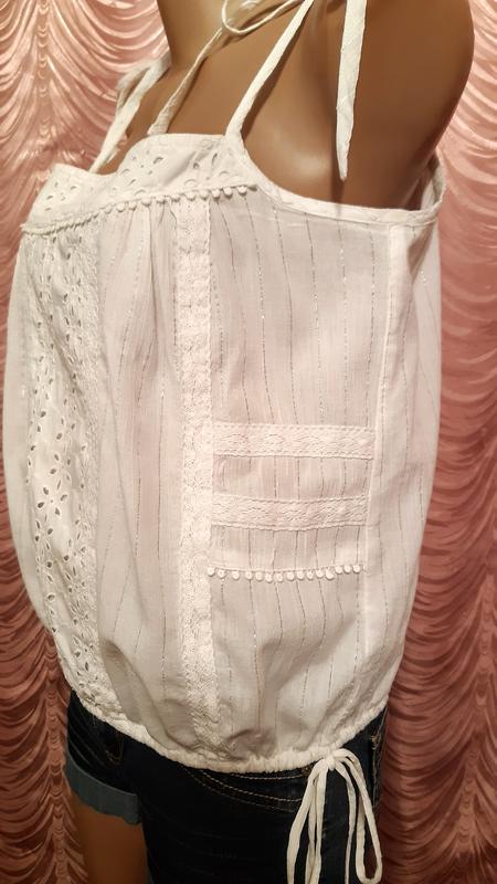 Кроп-топ,майка на завязывающихся бретелях від Британського бренду Monsoon. У відмінному стані. Колір біло-молочний. Попереду вставка з вишивкою (прошва). Основна тканина біла х/б в смужку з люрексовою сріблястої нитки. Відстань між смужками 2 див. В якості обробки використовується мереживо з рельєфів, на кокетці, на бочках. Вниз стягнуть на гумку, регулюється шнурком. Склад: 99% бавовна, 1% металізована нитка. Розмір М, це наш 46. Объём по груди в свободном состоянии 94 см. Объём по низу в собранном состоянии 88 см,тянется до 110 см. Длина от края бретелей до низа 56 см. Длина по боковому шву из-под мышек до низа 37 см.