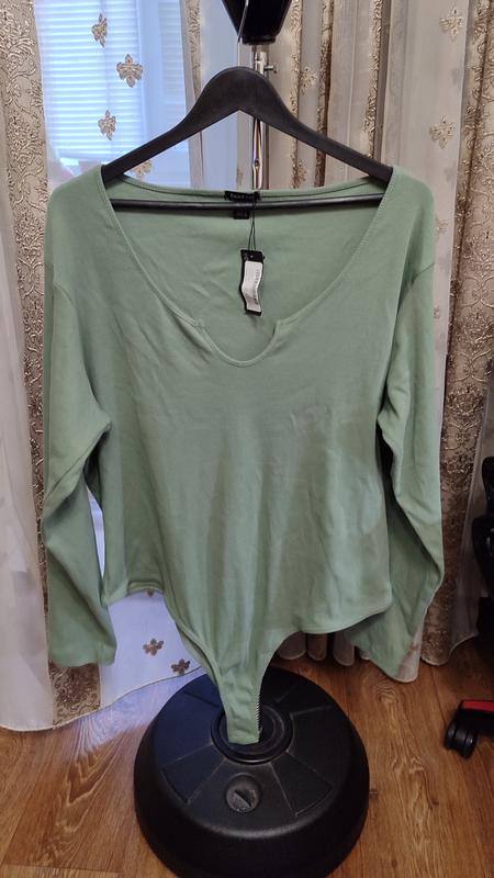 Боди в рубчик зелёный с длинным рукавом ПОГ. 70-85 ПОБ. 70-90 , Длинна 93, размер 28.,маленькая дырочка по шву на рукаве.