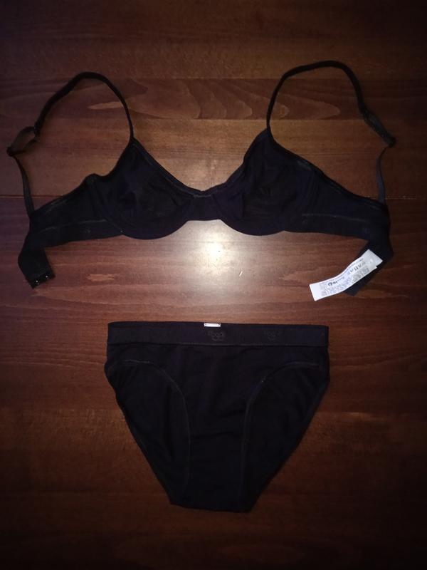 комплект жіночої білизни Sloggi Німеччина, іде на розмір XS-S, бюстгалтер 70 А-В уся довжина від застібки до застібки у вільному стані 55 см, трусики 36 європейський пояс 26,5; глибина 23. колір чорний. є й інші речі.