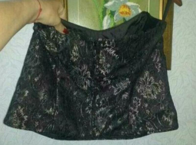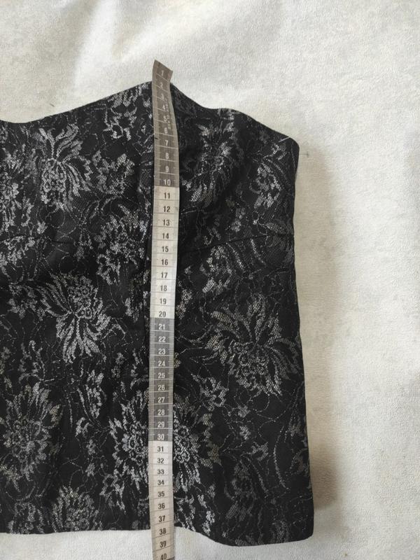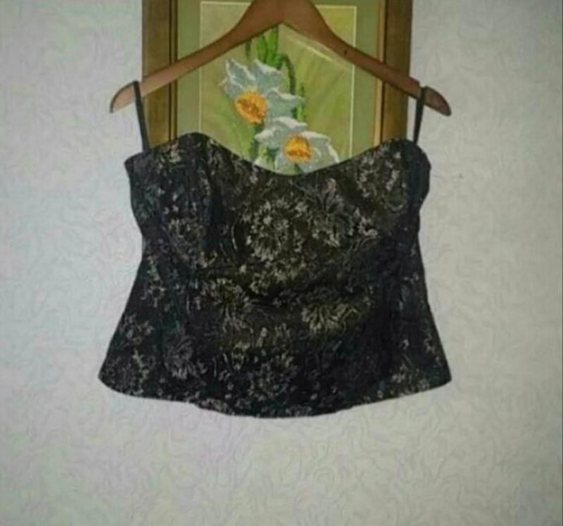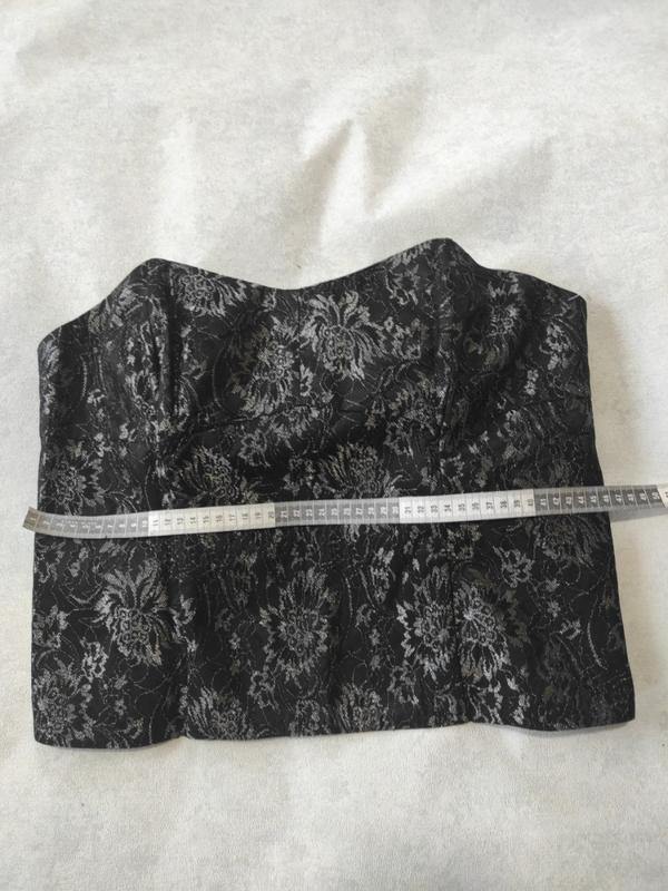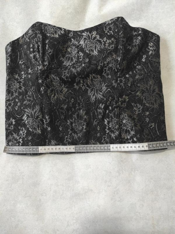 корсет, топ, чорний зі сріблястим жакардовим візерунком, стан ідеальний секонд слідів шкарпетки немає, на бирочку вказано 18 розмір, ближче до 14-16 орієнтуйтеся на заміри, тканина не тягнеться, є підкладка, є напрямні кісточки, довжина бічного шва 31, довжина по спинці 28, ширина по спинці зверху 50, по спинці внизу 51, НОГ 50+ виточки та вигин кісточок, ширина під грудьми 48-49, довжина від верху чашечки до низу 40, ззаду блискавка.