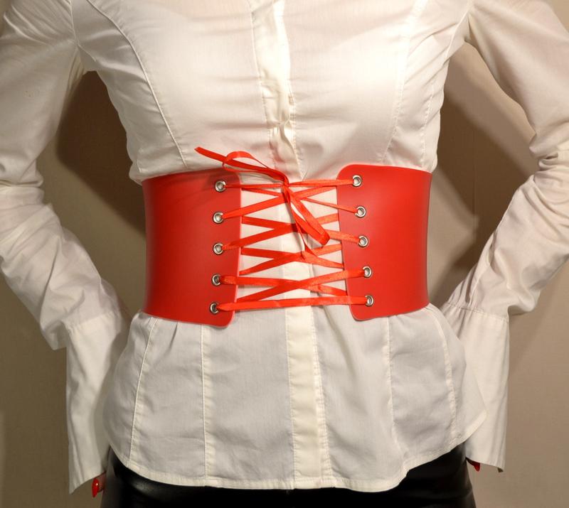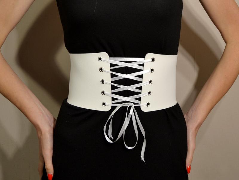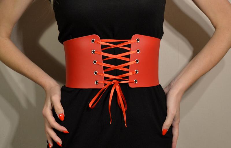 Шкіряний корсет можна носити з сукнею, блузкою, гольфом.