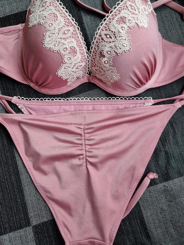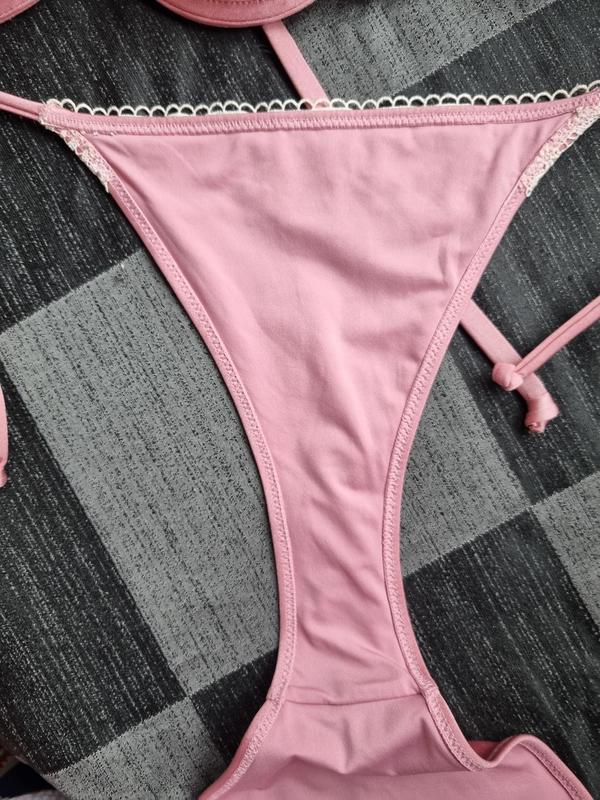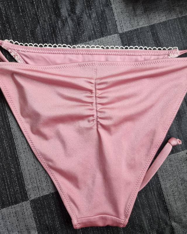 Плавки бикини на сплошной подкладке с кружевной отделкой спереди,завязками по бокам и присобранным швом сзади.