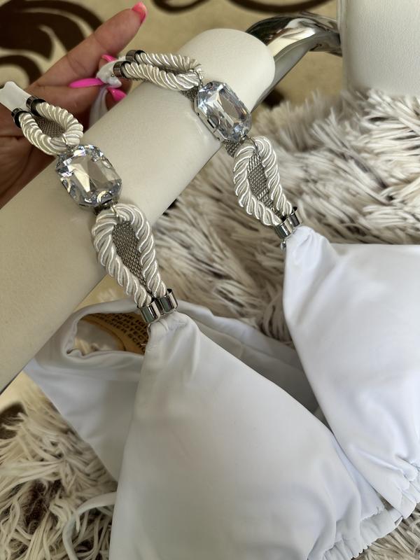 Продам білий купальник. Повністю новий. Без етикетки! Матеріал: еластан, чашки зйомні + блискучі камінчики. Фурнітура не ржавіє. Ідеальні ліф-трикутник з завʼязочками по спинці і шиї. Плавки з подвійною тканини і сборочкою на попі 🍑