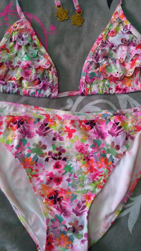 Барвистий купальник з рюшами. Фірмовий якісний стан ідеальний, зав'язки на шиї і на спинці, на кінцях зав'язок на ліфі і на трусиках - прикраса золотого кольору у вигляді квіточки. Чашки різнокольорові з фігурними вибитими рюшами, прикрашеними перфорацією по краях. Йде ліф шарами рюшек ,які візуально збільшують груди. Розмір ліфа - 14(42). Розмір трусиків - 16 (44).