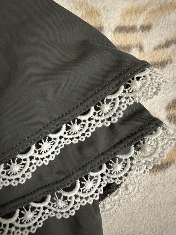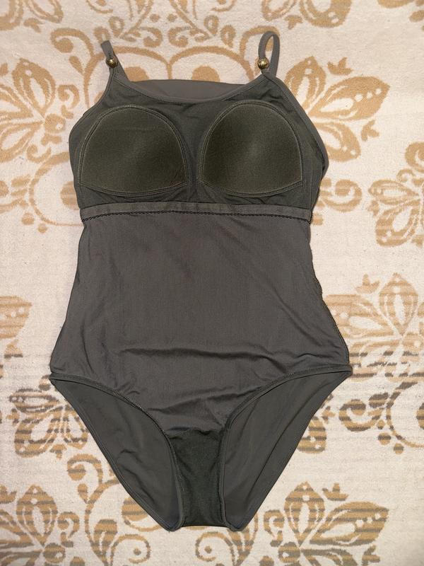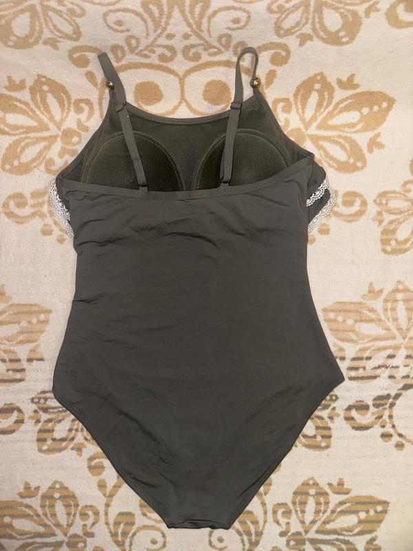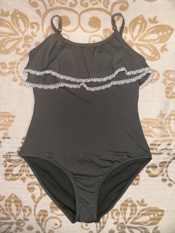 Суцільний купальник PRIMARK, в ідеальному стані🌷зона декольте декорована двома воланами з мереживом. За рахунок білого мережива формує ефектний бюст. На регульованих лямках - металевий декор. З чашечками. З переду - подвійна тканина для підтримки животику. Дуже гарно сидить на тілі, ховає недоліки фігури. Колір - сірий з легким відтінком оливи. В розмірі М - L.