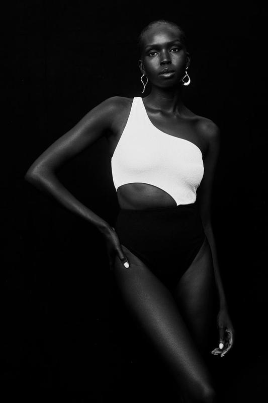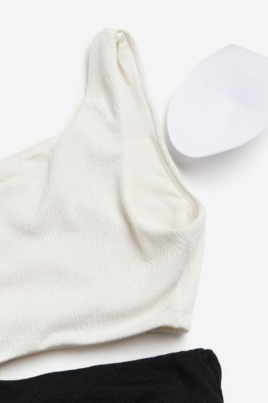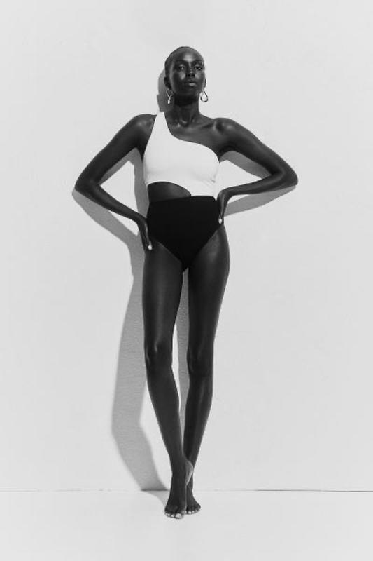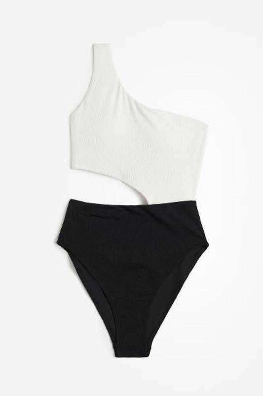 Купальник зі структурного переплетення. Підкладка цілком. Асиметричний виріз та одна широка бретелька. Чашки зі знімними устілками добре підтримують бюст і надають йому форми. Виріз на одній стороні талії. Сильні вирізи навколо стегон, середнє покриття спини.