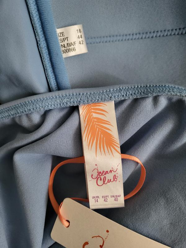 Ніжний небесно-блакитний купальник Ocean Club. Ліф бандо, чашка на поролоні, бретелі зоймні. Розмір на бірці вказано EU 42. Плавки зі стяжкою по боках, на підкладці. Розмір на бірці вказано EU 40.Зроблю заміри