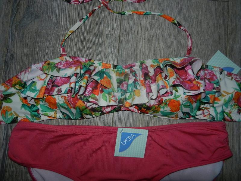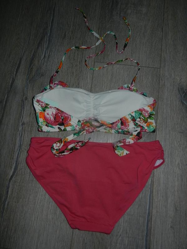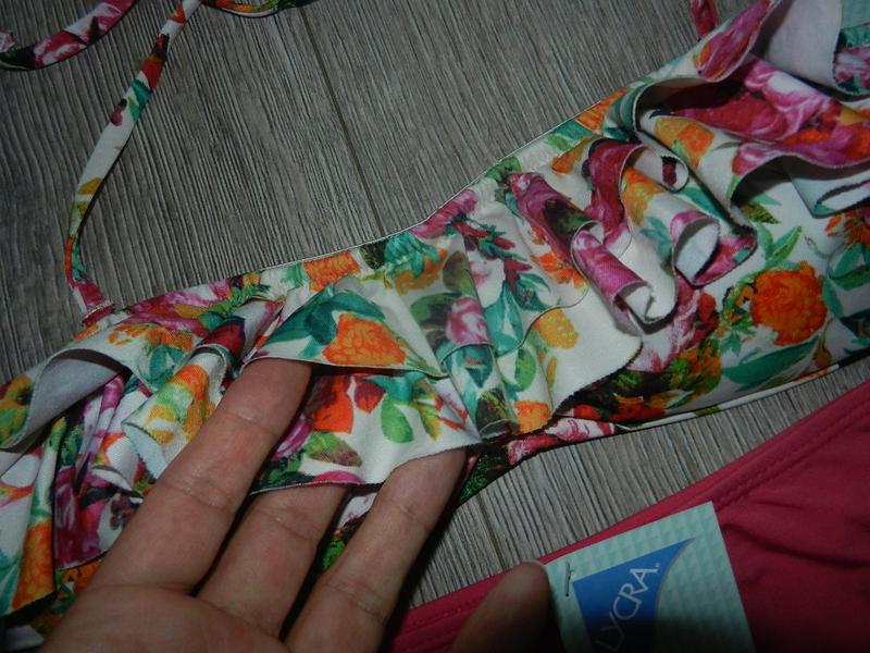 Бюстик бандо H&M на подкладке, с поролоновыми вкладышами, на вертикальных косточках, которые отлично держат грудь. зона декольте присобрана, декорирована рюшем, бретельки снимаются, по краям идут силиконовые полоски, не скользит, не сьезжает!