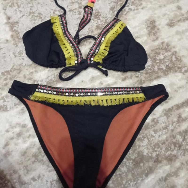 Роздільний купальник в етно стилі, чашечки шторки без поролону розмір вказаний 10 піт 35 см, висота посадки 21 див. Шторка ширина по низу 21 см, сторони трикутника 16 см