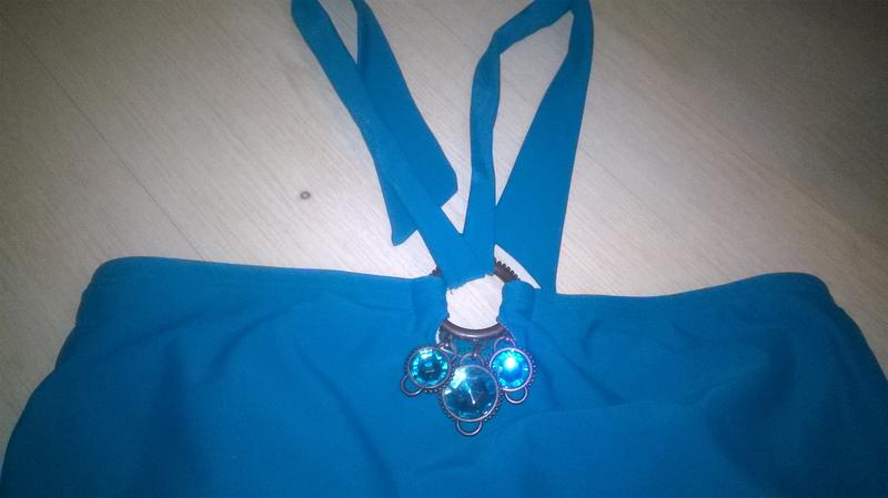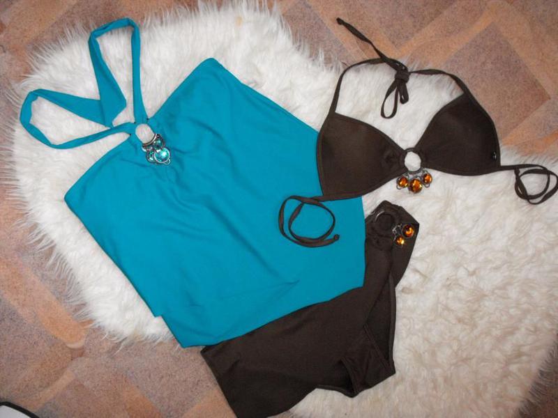 Купальник танкіні шоколад+бірюза (маєчка, плавки..шоколадна в дрібний бірюзовий горошок) прикрашений камінцями..Причина продажу - проліт з розміром...одягнені один раз... Виміри за запитом.