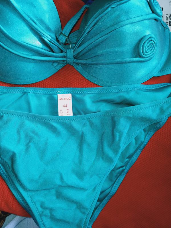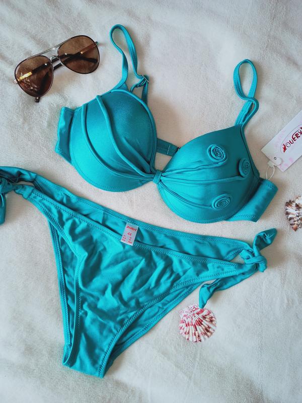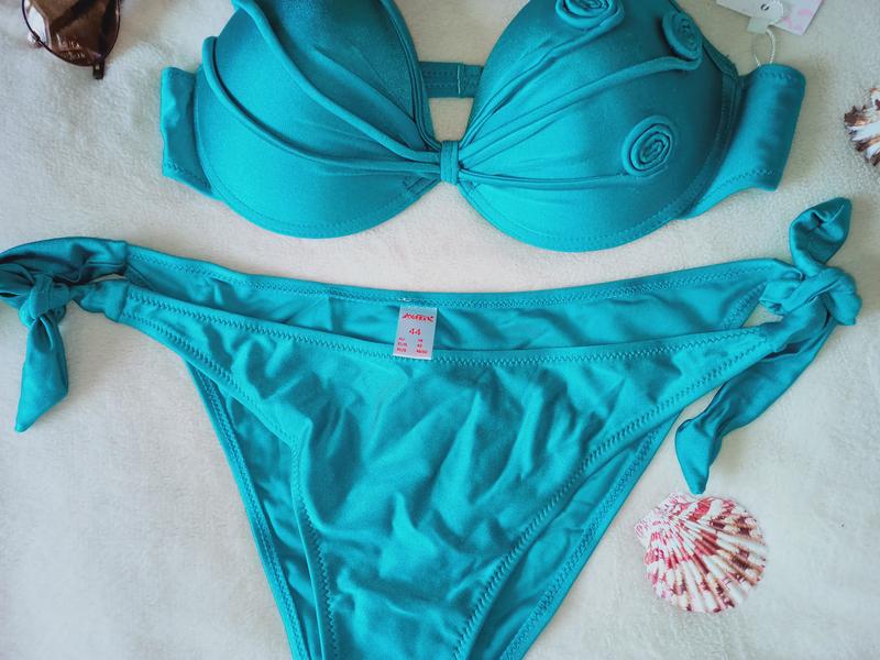 Абсолютно новий.Дуже хорошої якості. Красивий колір-світлої морської хвилі(на фото не вдається передати-виходить бирюзовее,ніж в реалії). Трусики -бікіні на зав'язках з боків. Бюст з невеликим пушапом. на етикетці вказаний 44евроразмер. Обхват під грудьми в ненатянутом вигляді 78 см, тягнеться до 92-94см, ширина чашки 20 см, висота чашки 19 див. Чашка сформована, на кісточках. Ширина плавок вгорі в ненатянутом вигляді 35 см,без зав'язок(зав'язати можна на будь-який обсяг),тягнуться до 43см) висота плавок 25 см..