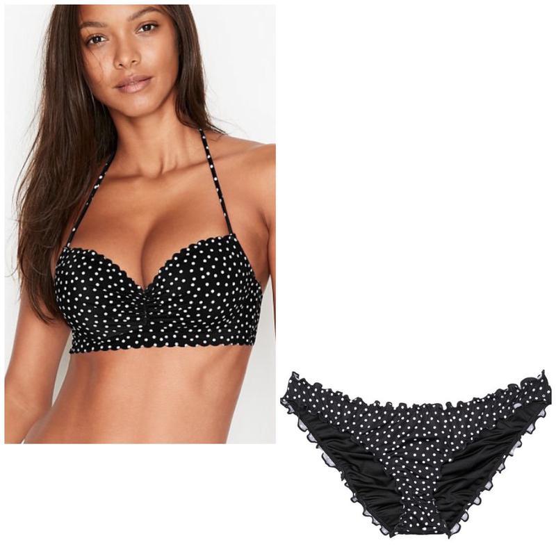 Купальник Victoria's secret 100 % оригінал з Америки Верх Victoria's Secret Zuma Demi Swim Top на щільному чашці без пушап, шлейки регулюються на шиї, позаду регульована застібка золотого кольору Низ Capri Ruffle Cheeky Swim Bottom призібрані ззаду Ліф 34C (75C або 80B) плавки в розмірі xs