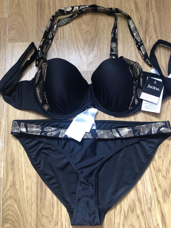 Продам новий купальник, дуже гарний, чорного кольору з золотистими пір'їнками, розмір верх L 85C, плавки XL 50р.