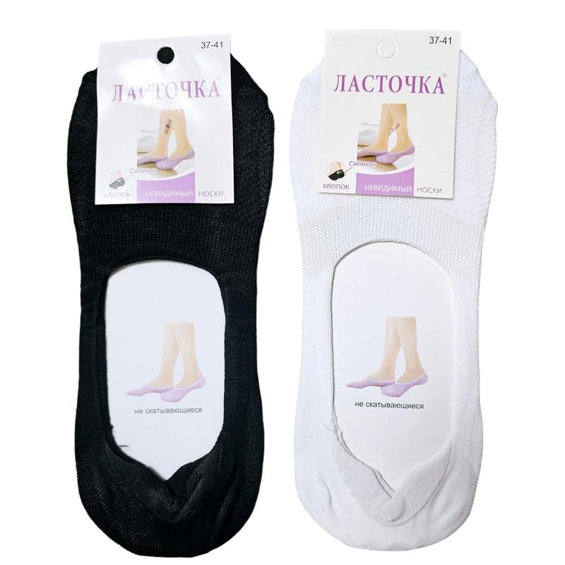 Жіночі сліди шкарпетки. Шкарпетки з дихаючим верхом і просили коненою п'ятою. Виробник слідів: Ластівка Склад шкарпеток: 55% бавовна, 27% бамбук, 15.5% — еластин, 2.5% — поролон. Розмір жіночих слідів: 37-41 Колір жіночих слідів шкарпеток: білий, чорний. УВАГА Оптова ціна вважається, якщо йде 2пари чорних і дві пари білих слідів!!