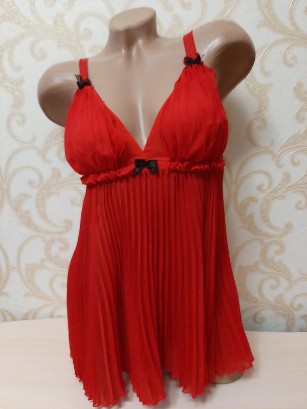 Гарний яскравий короткий напівпрозорий пеньюар плісе Dreamgirl Довжина регулюється бретелями Довжина по бічному шву від пахви та по спинці без бретелей 39 см Ширина по гумці під грудьми 32 см, тягнеться до 45 см Чашка без поролону Висота чашки 17 см, ширина 19 см