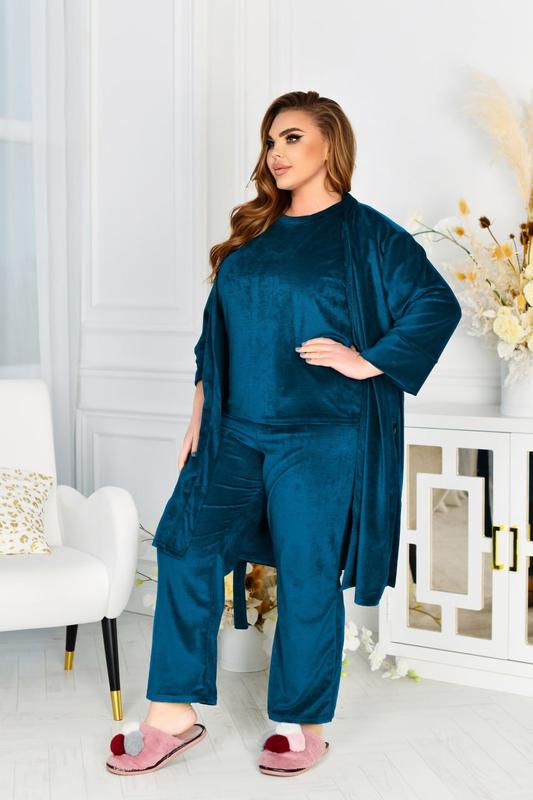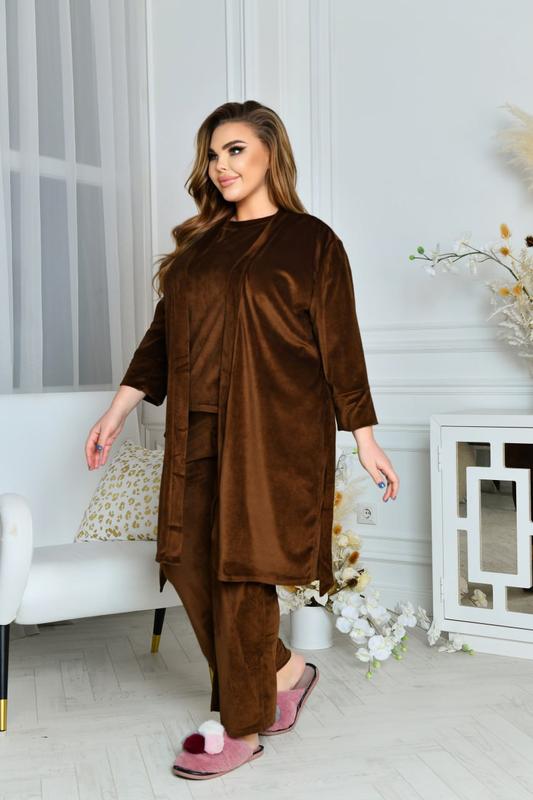 Неймовірно зручний домашній комплект - топ, штани та халат з м‘якого, приємного до тіла велюру в рубчик ( розтяжність гарна).