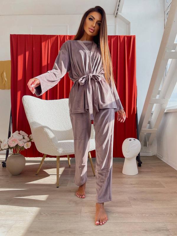 Набір трійка для дому! Цей розкішний велюровий жіночий костюм ідеально підходить для стильного домашнього відпочинку. В комплект входять футболка, штани та халат. Комплект виготовлений з м'якого і приємного на дотик велюру.