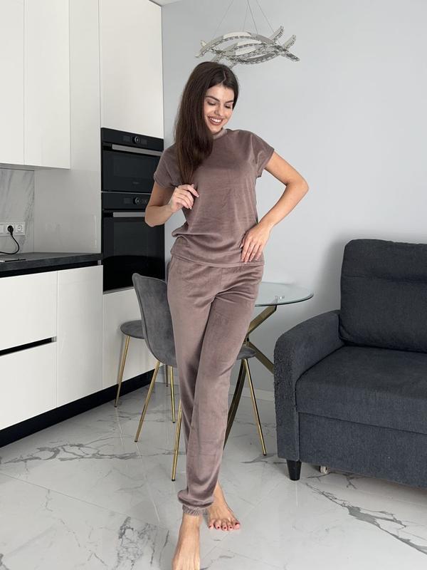 Домашній комплект трійка (шорти, штани, кофта) з плюш-велюру кольору мокко
