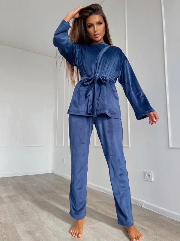 Комплект трійка для дому. Цей розкішний жіночий велюровий костюм ідеально підходить для відпочинку вдома. До комплекту входять футболка, штани та халат. Комплект виготовлений із м'якого та приємного на дотик велюру. - Піжама -- трійка - Тканина -- щільний велюр - Розміри: 42-44, 46-48, 50-52 - Кольори: мокко, чорний, синій