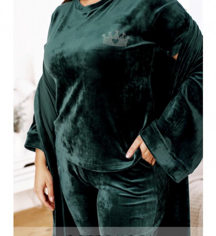 Стильный и комфортный костюм-тройка батал. В комплекте халат со врезными карманами по бокам, декорирован рисунком из страз на спине, застёжек нет, в комплекте пояс, для него - две шлейки по бокам. Футболка без застёжек и карманов, на груди - узор из страз. Вырез горловины полукруглый, рукава с небольшими мягкими манжетами. Брюки с высокой талией, вшитой в пояс резинкой и врезными карманами по бокам. Пояс/аксессуар входит в комплект. ❗❗❗ УВАГУ! Згідно з постановою Кабінету міністрів України від 19.03.1994 року №172 "Про реалізацію окремих позицій" Закону України "Про захист прав споживачів", дана модель поверненню та обміну НЕ ПІДЛЯГАЄ! Орієнтовні заміри по готовому виробу: Халат: 💙50-52 р-р: довжина кардігана 95 см, довжина рукава від горловини 57см, обхват рукава 44см, ОГ - 122см, ВІД -122см, ПРО -126см. 💙54-56 р-р: довжина кардігана 95 см, довжина рукава від горловини 58см, обхват рукава 48см, ОГ - 130см, ВІД -128см, ПРО -130см. 💙58-60 р-р: длина кардигана 95см, длина рукава от горловины 59см, обхват рукава 52см, ОГ - 140см, ОТ -138см, ОБ -140см.