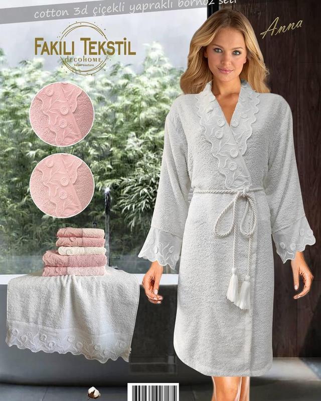 Набір складається з трьох позицій: халата та двох рушників. Легкий лазневий