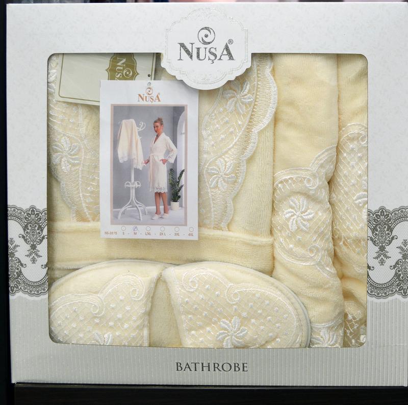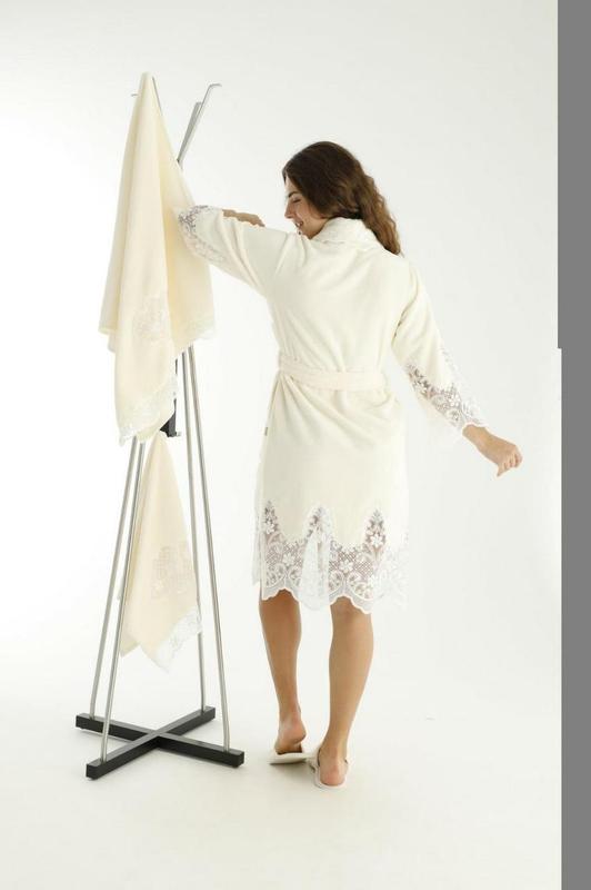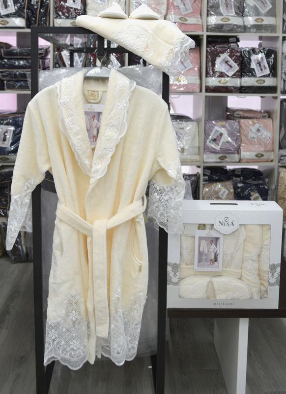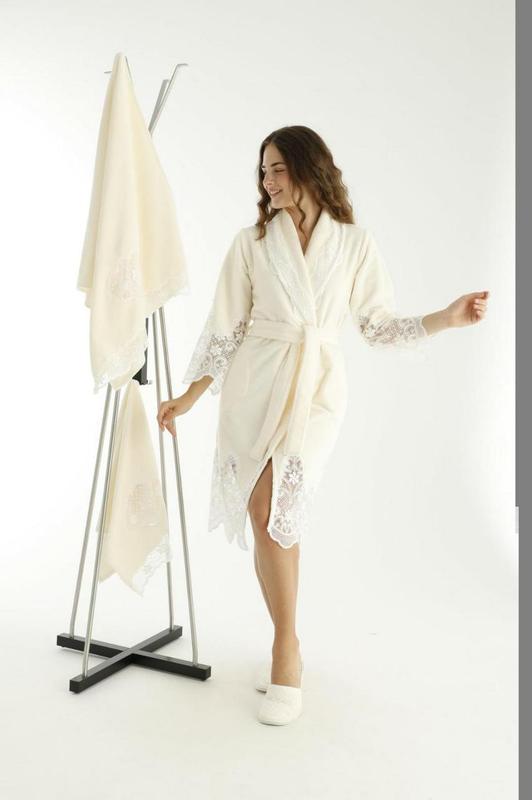 Набори халатів і рушників жіночі махрові з мереживом, комплекти халати з
