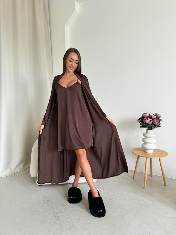 Шовковий набір сорочка та халат максі 😍 Сорочка на брительках, які регулюються. Халат на запах із поясом. Тканина: Шовк армані. Трохи маломірить ⬇️Підійде на: S-M: ОГ 82-95 см, ОБ 86-96 см. L-XL: 96-106 см, ОБ 96-106 см. Є наложений платіж по передоплаті