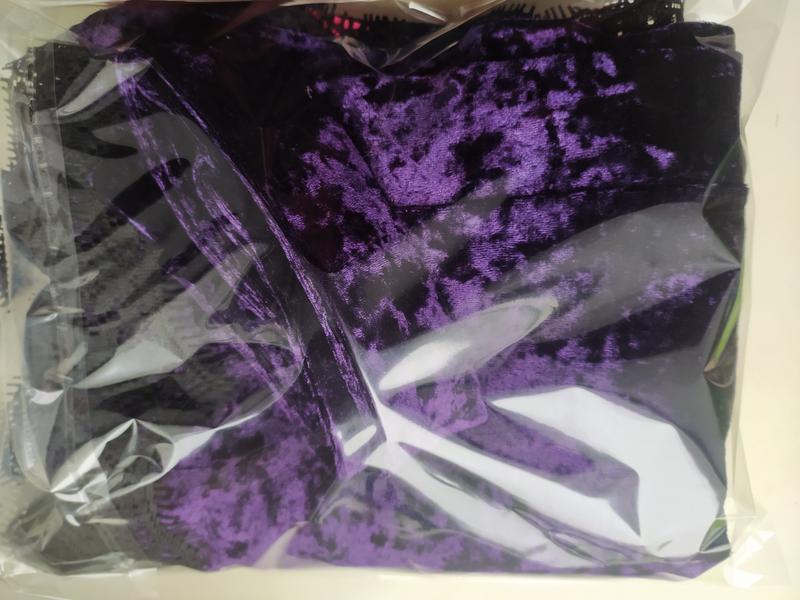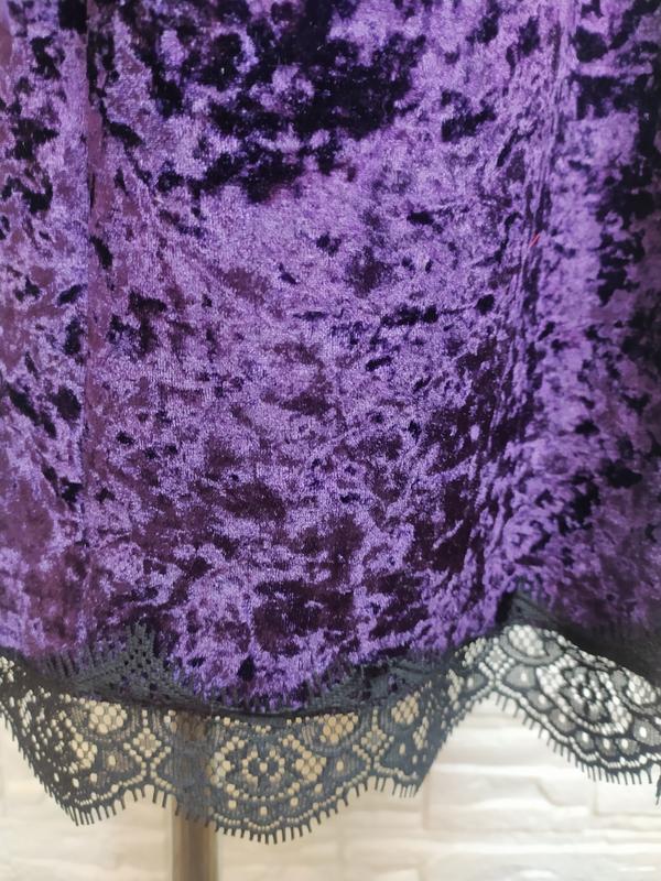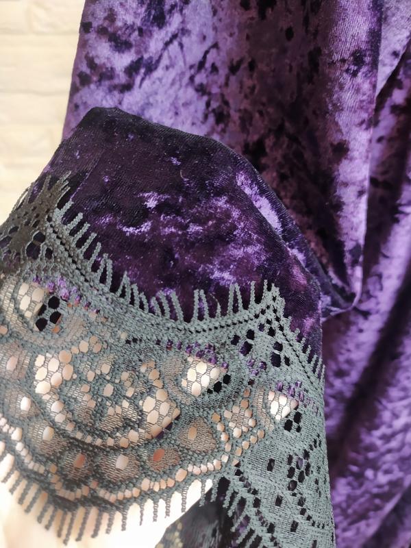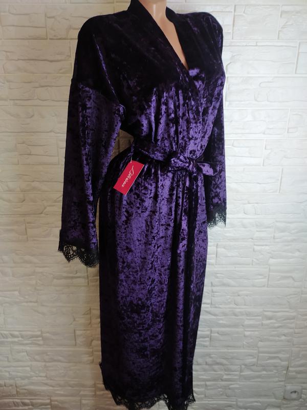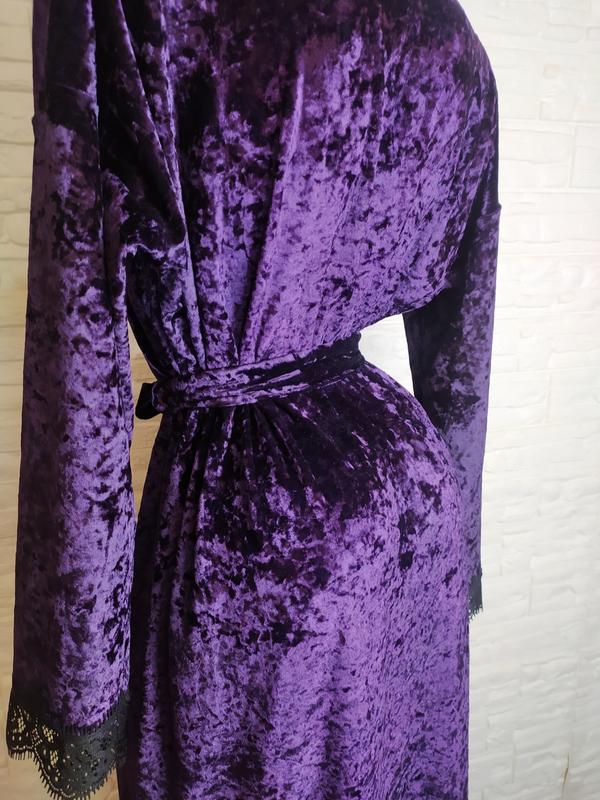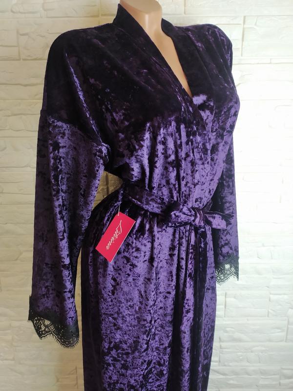 М'який мармуровий велюр, фіолетовий колір. Халат на запах, з гарним мереживом, довгий рукав, пояс в комплекті. Довжина -1.25 м.