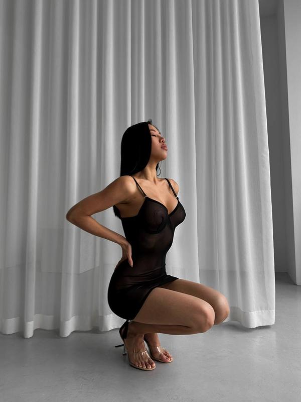 Спокуслива нічна сорочка на шнурівці з ніжної сіточки. Бюст має кісточки, шлейки з регуляторами. Трусиків у комплекті немає.