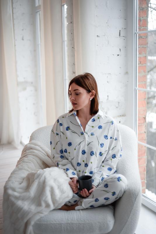 Жіноча піжама з теплої якісної фланелі, яка гарно веде себе в процесі носіння, не кошлатиться.