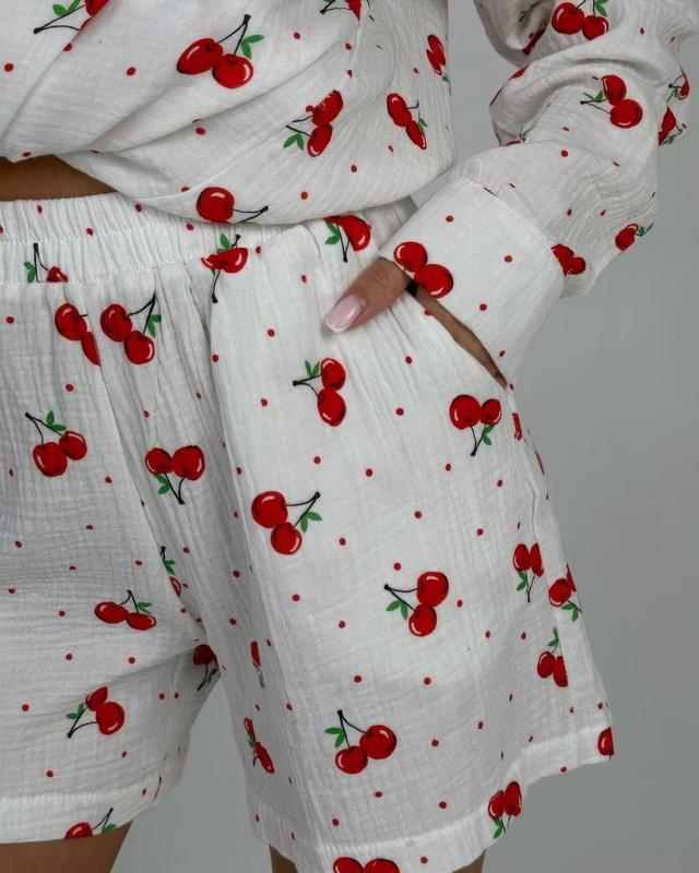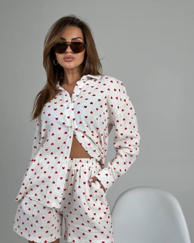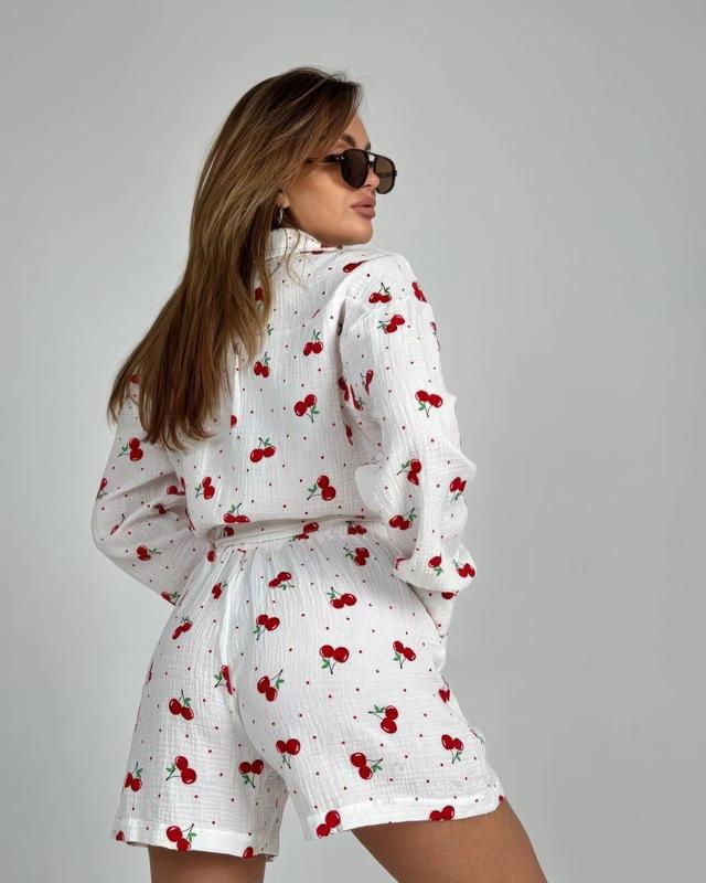 Шикарний костюм з бавовняної тканини муслін у гарних кольорах. Сорочка на гудзиках, шорти на резинці. Жіночий і ніжний образ, ідеальний крій, відмінне пошиття.