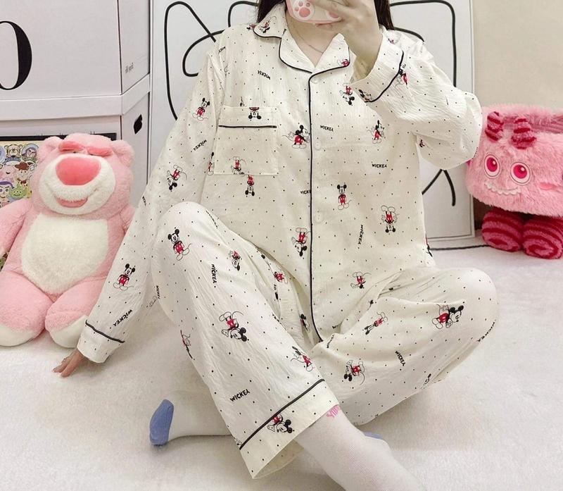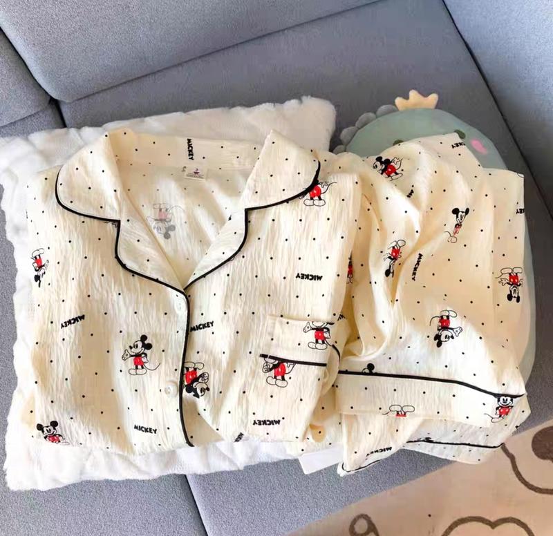 Дуже приємна до тіла піжама з Міккі. Тканина натуральна бавовна з ефектом жатки, трохи тягнеться. М'яка та комфортна. Колір піжами більш кремовий/бежевий, не білий.