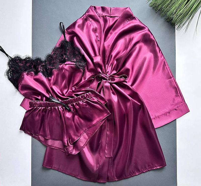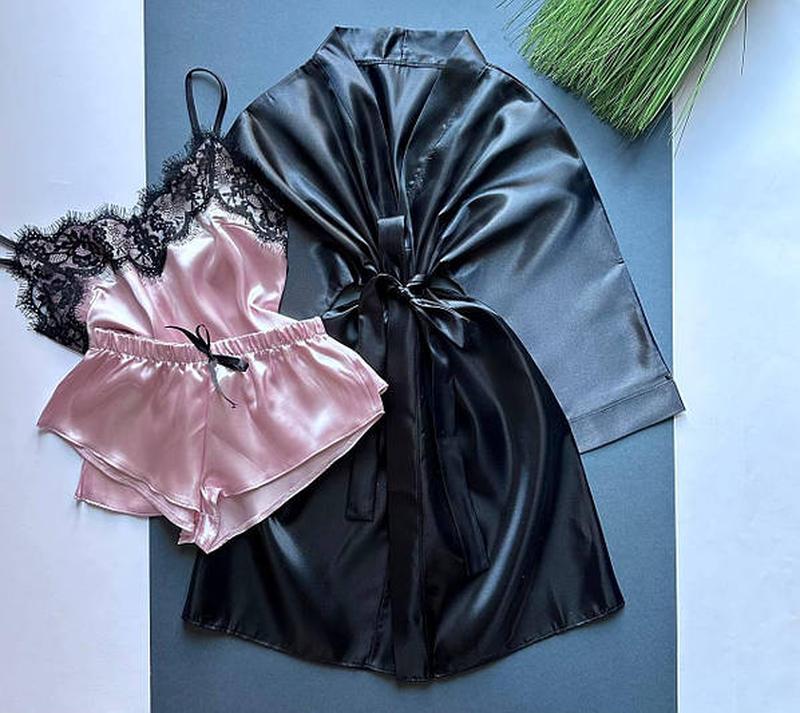 Халат і піжама з атласу, халат з піжамою атлас, піжама атласна топ і шорти і халатик