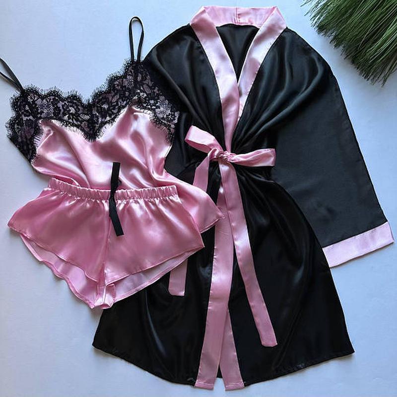 Комплект піжама жіноча з мереживом комплект 3 в 1 халат і піжама з майкою, шортами