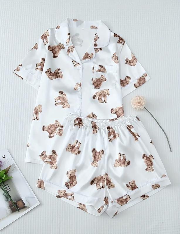 Милий комплект піжами з атласу з принтом ведмедика Тедді, топ з коротким рукавом, на ґудзиках.