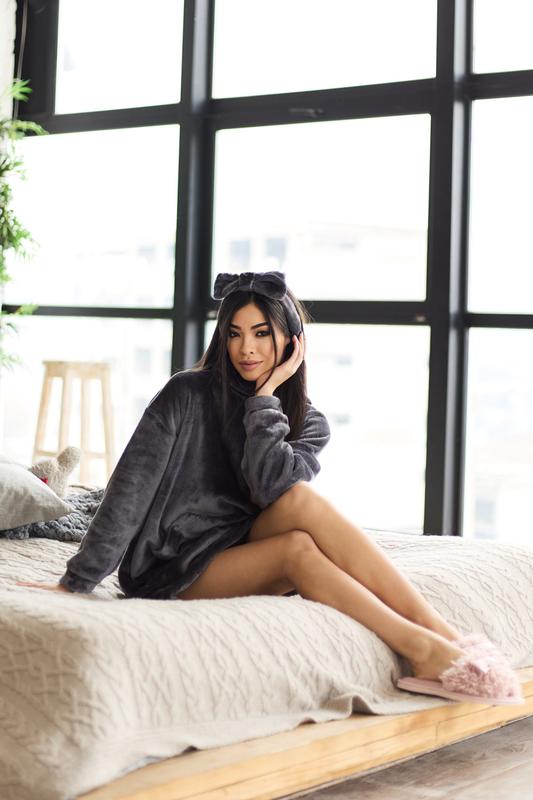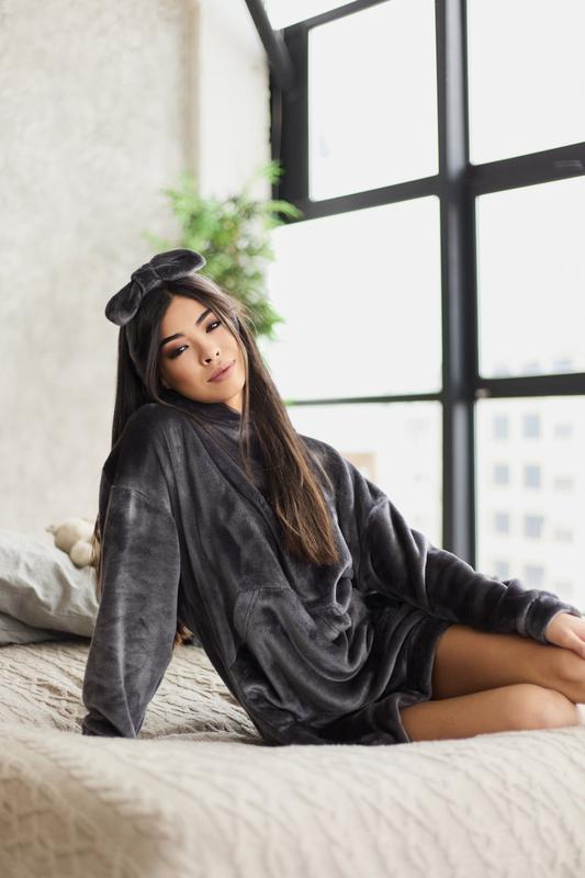 Очень мягкая и теплая пижама выполнена из махровой ткани. Свободный крой. Есть капюшон. Спереди накладной карман-кенгуру. Манжеты на рукавах и обтачка низа.