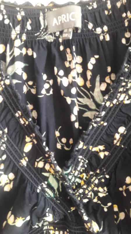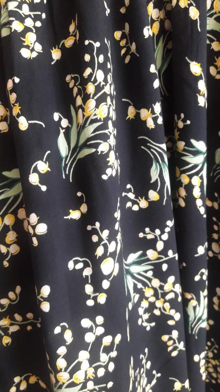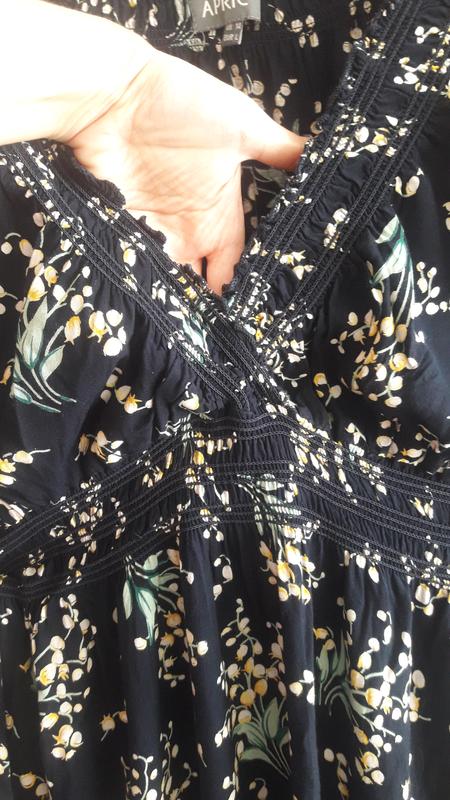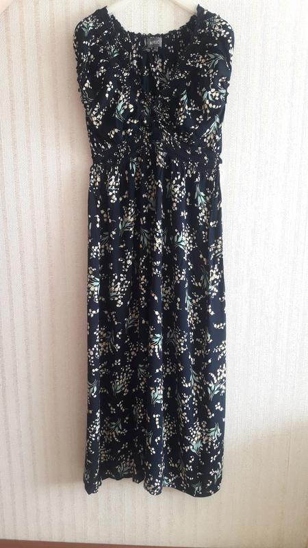 Чудова віскозна сукня! Практична, не просвічує, сильно не мнеться, витончує стан! Завищена талія. В-образний виріз іде на запах. Під грудьми не туга резинка. Невеличкий рукавчик прикриває плече. Колір темно синій в конваліях. Розмір L чудово, можна М.