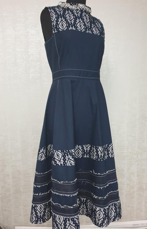 Розкішна сукня з цупкої бавовняної тканини приталеного силуету, розкльошена до низу.Сукня декорована вставками з гіпюру та нашитими смужками з джинсової тканини з бахромою. Потайна застібка-блискавка розташована на спині (по центру), довжиною 56см + ґудзик на повітряній петлі.