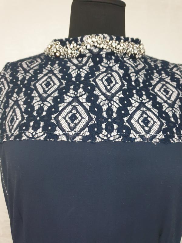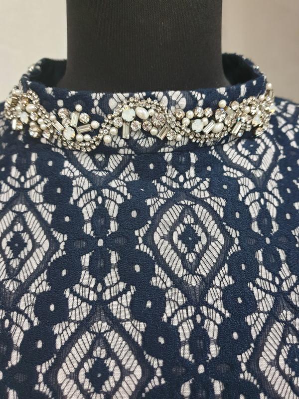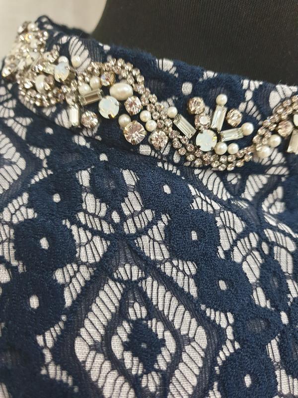 Комір-стійка, розкішно декорований кристалами Сваровські, перлинами та місячним камінням. Бірка зі складом матеріалу зрізана. Стан нової речі