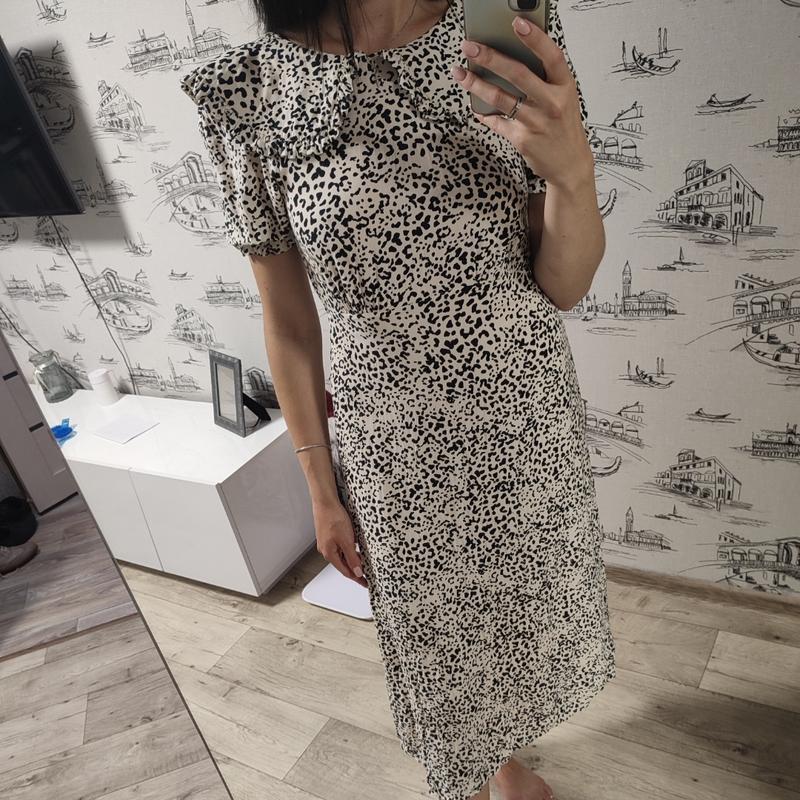 Сукня в ідеальному стані New Look. 100% віскоза. Виглядає дуже ніжно та в одночас стильно. Застібка біля шиї гудзик, також фіксуються тоненьким поясом ззаду. Недоліків немає, стан як на фото.